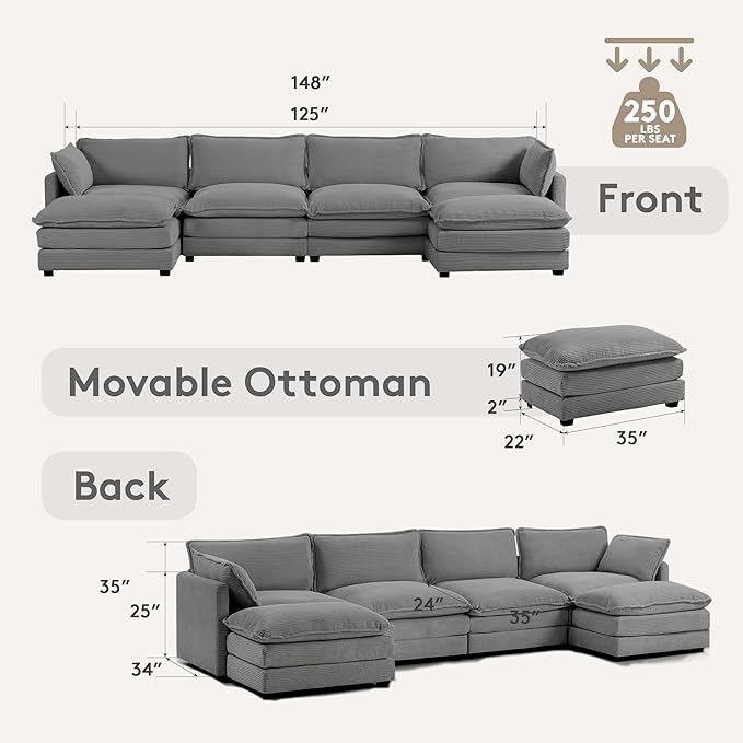 - Spacious Seating Space: The overall dimensions of the sofa: 34.3"D x 147.6"W x 33.5"H. With 30% more seating width than similar competitors, this sofa is suitable for any body size. Whether sitting on it with a cup of coffee or reclining on it to watch a movie, you'll have a spacious space