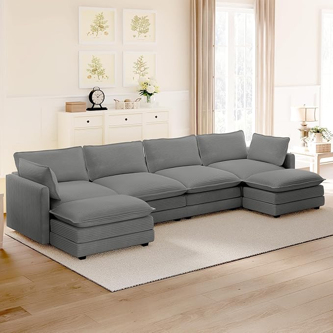 ROWHY 148'' Sectional Cloud Couch with 2 Ottomans, Oversized 4 Seat Sleeper Sofa with 2 Throw Pillows, Convertible Upholstered U Shaped Cozy Sofa Furniture Set for Living Room and Office, Dark Grey