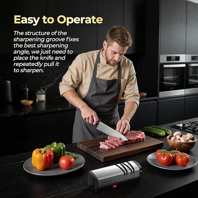 - Professional at Home Kitchen Knife Sharpener - Narcissus S867 Knife Sharpener features a dual sharpening system for quick and efficient knife maintenance. The crude slot rapidly sharpens dull blades, while the fine slot polishes the edge to a smooth, burr-free finish. Experience restored knife sharpness in just seconds, perfectly meeting your edge maintenance needs.