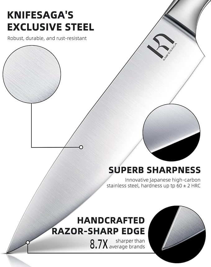 - 【CONFIDENCE IN EVERY CUT】KnifeSaga has developed an innovative steel with optimized structural composition and carbon content. Each blade features an incredibly sharp 10° cutting edge, ensuring every slice is smooth, swift, and precise.