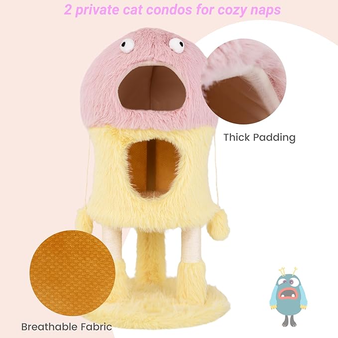 - Monster-themed Design: Featuring adorable eye decoration, goofy large mouth and furry hands & feet, this monster-themed cat tree in vibrant pink & yellow hue is not just a cat tower but an eye-catching addition to your home.