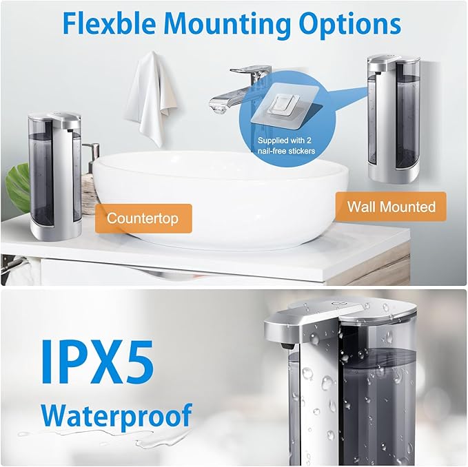 - [Wall-Mounted & Countertop] You have the flexibility to place the automatic soap dispenser directly on your countertop or affix it to the wall for space-saving convenience. With its fresh, distinctive appearance, it transforms your kitchen, bathroom, or any commercial space, improving functionality and adding a touch of elegance to your countertop