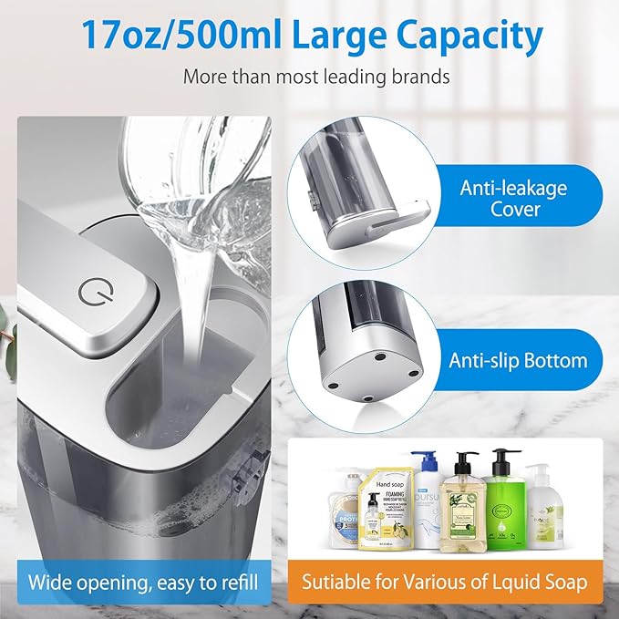 - [Large Capacity&Wide Application]This automatic dish soap dispenser has a large and wide filling port, making it easy to fill liquid soap. It comes with a 17oz/500ml large capacity and transparent container, larger than most soap dispensers on the market, which helps avoid frequent refilling. It is compatible with most liquids such as hand sanitizer, dish soap, body wash, shampoo, gel hand sanitizer, body lotion, and many more