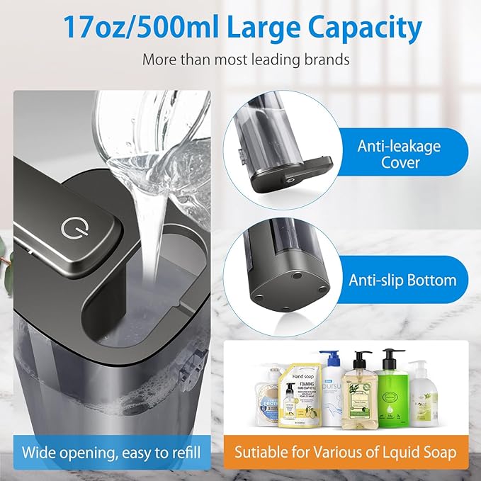 - [Large Capacity&Wide Application]This automatic dish soap dispenser has a large and wide filling port, making it easy to fill liquid soap. It comes with a 17oz/500ml large capacity and transparent container, larger than most soap dispensers on the market, which helps avoid frequent refilling. It is compatible with most liquids such as hand sanitizer, dish soap, body wash, shampoo, gel hand sanitizer, body lotion, and many more