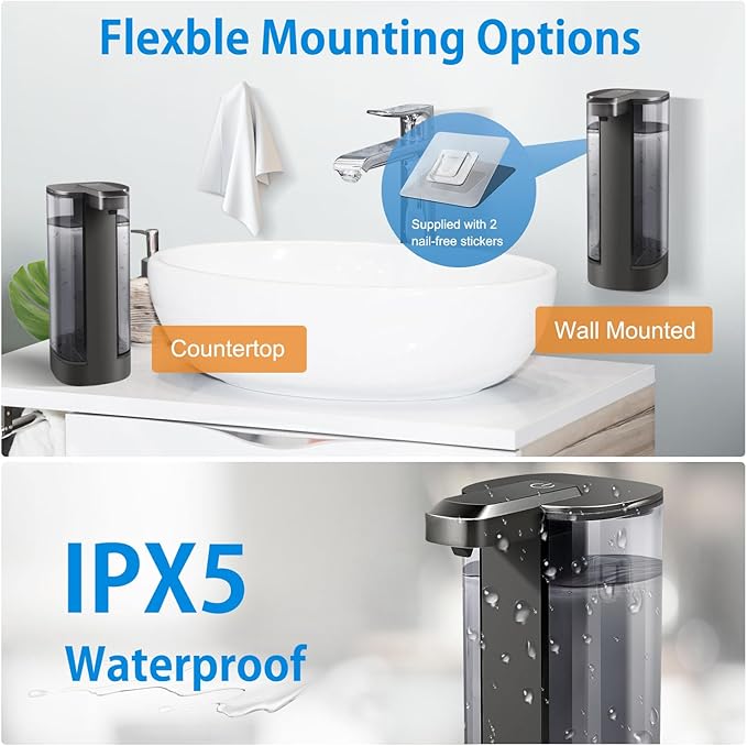 - [Wall-Mounted & Countertop] You have the flexibility to place the automatic soap dispenser directly on your countertop or affix it to the wall for space-saving convenience. With its fresh, distinctive appearance, it transforms your kitchen, bathroom, or any commercial space, improving functionality and adding a touch of elegance to your countertop