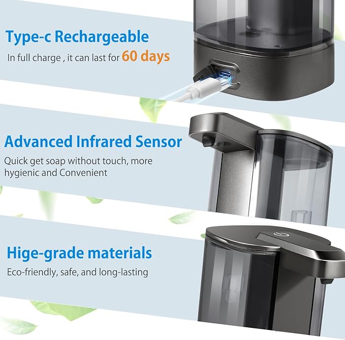 - [USB Rechargeable & Long-lasting] Our automatic soap dispenser features a USB rechargeable design, and a charging cable is included in the package. With a built-in 1200mAh battery, a single full charge empowers it to function around 5000 times, equivalent to approximately 2-3 months of regular use. This prevents you from frequently charging the hands-free soap dispenser