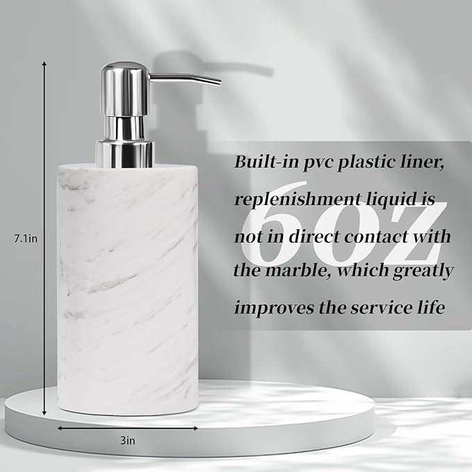 - 【Size / Capacity】: Measuring 7.1 * 3 inches and boasting a generous capacity of 6 ounces, our soap dispenser strikes the perfect balance between form and function. Please note: slight cracks on the surface are a natural formation of marble, adding character and uniqueness to each piece
