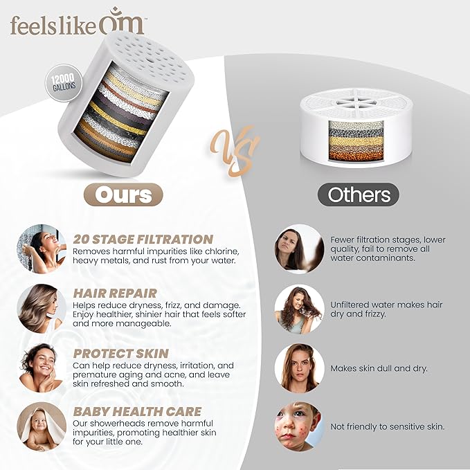 - TRANSFORMATIVE HAIR & SKIN BENEFITS: Watch your hair and skin thrive with our showerhead filter for hard water! The Feels Like Om shower head with filter removes harsh minerals that cause dry, brittle hair and irritated skin. Users love their softer, more manageable hair, clearer skin, and reduced irritation. Our filtered shower head's multi-stage system helps restore natural pH balance for healthier hair and skin.