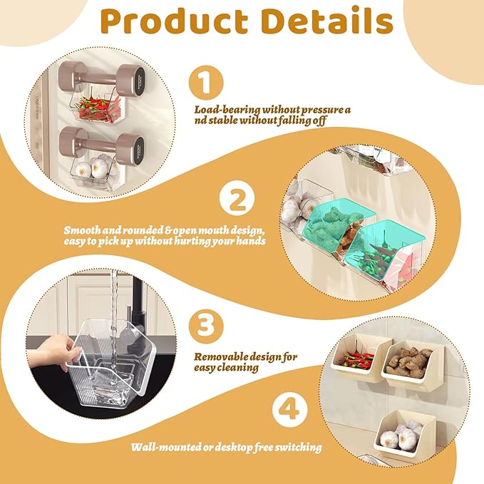- ๐[TRANSPARENT DESIGN] The wall storage bins all feature a transparent design that allows you to see the contents at a glance and quickly find what you need, thus making it easier for you to manage and utilize the items in your daily life. The simple transparent appearance can blend perfectly with the decor of any room, adding a sense of neatness and organization to your home space.