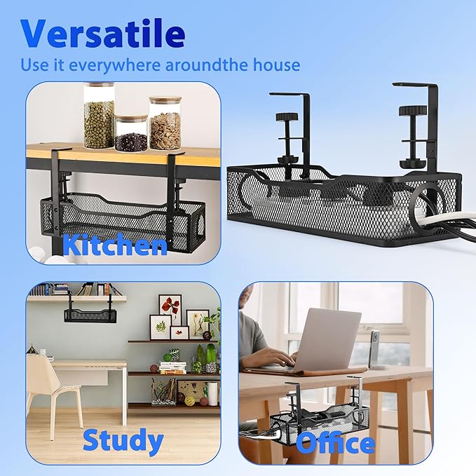 - 【Space-Saving Under Desk Cord Management Rack】Free up valuable desktop space by storing cables under your desk. This compact cord management holder keeps wires off the floor and out of sight—ideal for small desks and tidy workstations.