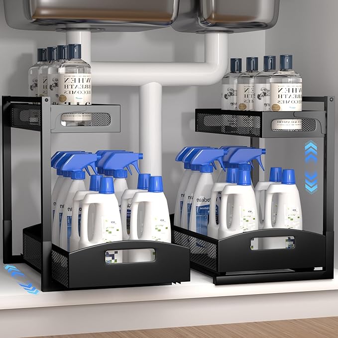 Under Sink Organizer,2 Pack Height Adjustable Under Sink Organizers and Storage, 2 Tier Under Sink Storage for Kitchen Bathroom Cabinet