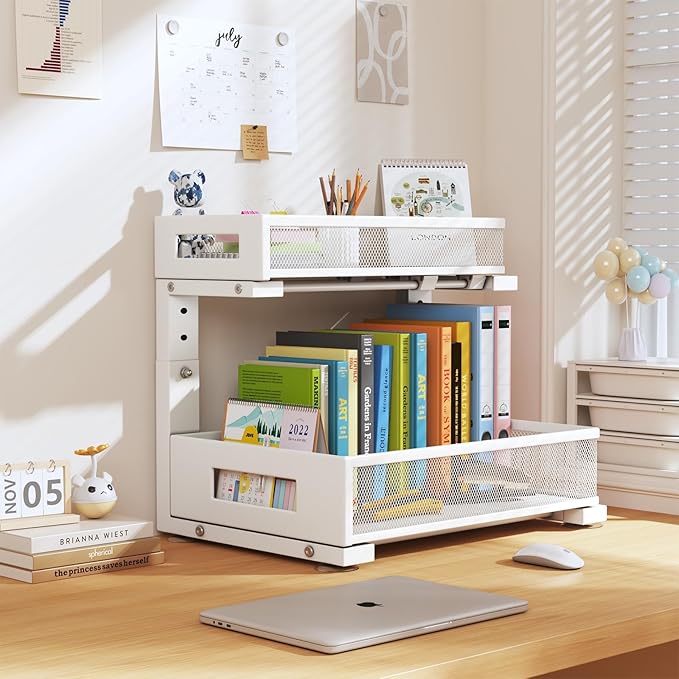 2-Pack Under Sink Storage Organizer, Large 2-Tier Elegant Mesh Pull Out Shelf for Kitchen and Bathroom Cabinet Organization, L-Shaped and Adjustable Height Design for Maximum Space Efficiency-White
