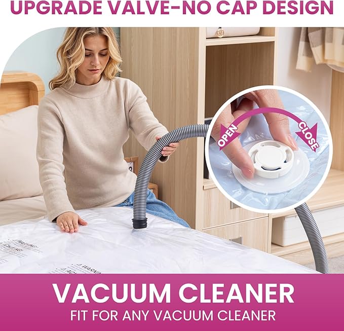 - Efficient Closure System: Works with standard vacuum cleaner. Simply put the items in our storage vacuum bag, seal the zipper, open the valve, suck out the air, close the valve. After all, store the compressed bag in closet, underbed or wherever you want