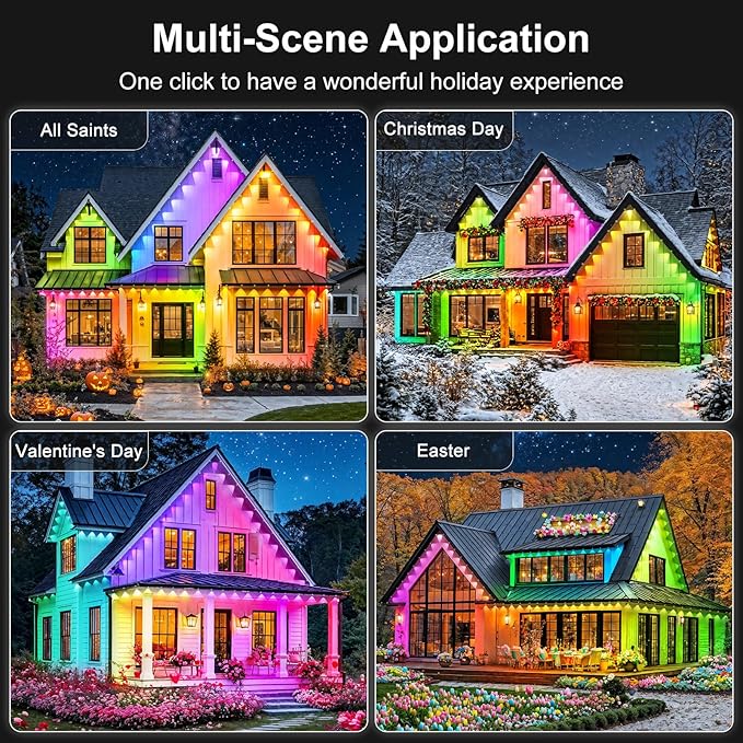 - DYNAMIC MODE SELECTION:Our LED permanent lights offer a variety of dynamic mode options so you can easily switch between different lighting effects depending on your mood and occasion. Whether it's soft ambient lighting for moments of relaxation and rest, or vibrant party lighting to add a lively atmosphere to a gathering, our fixtures can easily meet your lighting needs