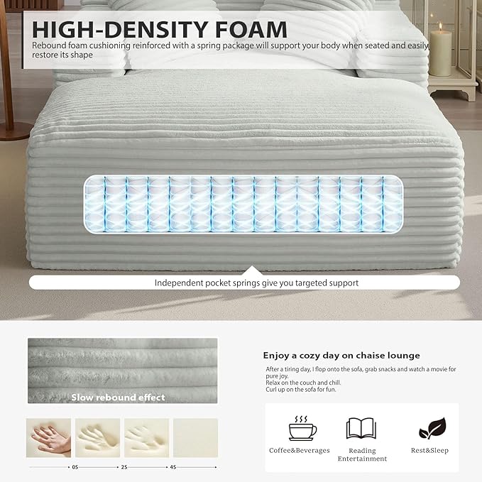 - No Need to Install - Unboxing the large chaise lounge is as simple as it gets—no assembly needed. Just give it a light tap once you've taken it out of the packaging, and chaise chair will gradually bounce back to its original shape within 48 hours. So it is not so fluffy and comfortable when you just unpacked it, you can pat the cushion to make it fluffy and feel better. Our chaise lounge sofa oversize chair comes compactly packed in a single box for your convenience