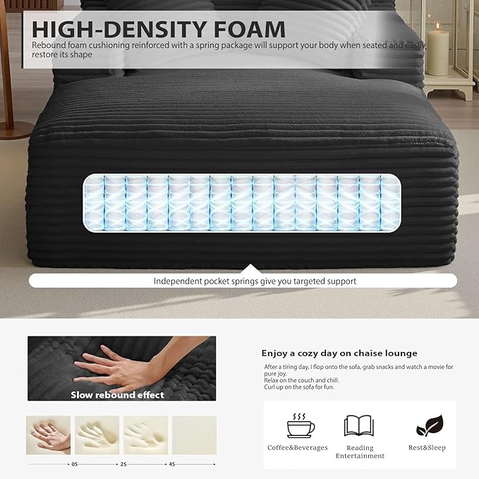 - No Need to Install - Unboxing the large chaise lounge is as simple as it gets—no assembly needed. Just give it a light tap once you've taken it out of the packaging, and chaise chair will gradually bounce back to its original shape within 48 hours. So it is not so fluffy and comfortable when you just unpacked it, you can pat the cushion to make it fluffy and feel better. Our chaise lounge sofa oversize chair comes compactly packed in a single box for your convenience