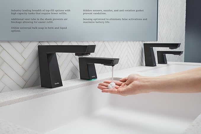 - ERGONOMIC DESIGN: Having the space to properly rinse, lather, and rinse again is ideal for any restroom. Thanks to the extended spouts, there is more space for handwashing as well as less soap getting on or around the sink, instead of inside like it should be.