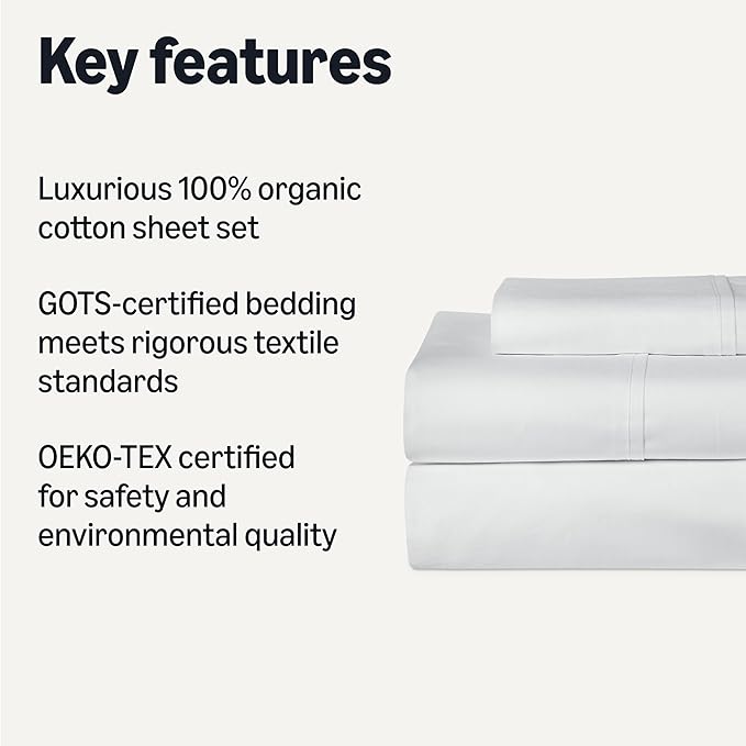- Organic cotton sheet set with flat sheet, fitted sheet, and matching pillowcase