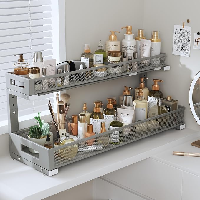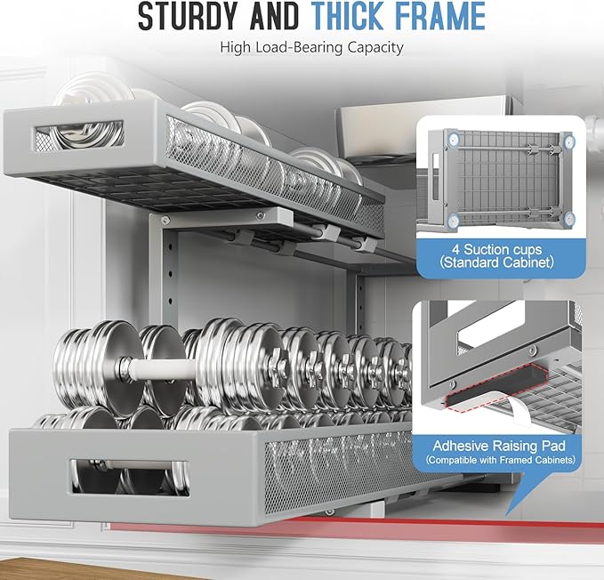- 【2-Tier Pull-Out Design for Easy Access】This under-sink organizer features a double-layer pull-out design, allowing you to easily access items at the deepest part. The upgraded, thickened iron circular sliding rails ensure a smooth and seamless pulling experience, making each use effortless. The unique pull-out locking mechanism effectively prevents the drawers from being completely pulled out, avoiding the risk of items falling or structural damage caused by over-pulling, ensuring safer and more convenient use.