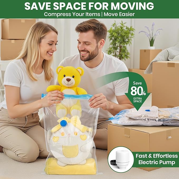 - Space Bags with Fast&Effortless Electric Pump-Vacuum storage bags with electric pump,ideal for people with limited hand strength.Time saver compression packing bags helps you when you’re in a rush, such as during business trips or catching a travel flight.Save efforts when dealing with large and heavy duty vacuum sealing storage-housewives handling bulky home storage jobs,singles moving to a new home,or freshman students moving to college.