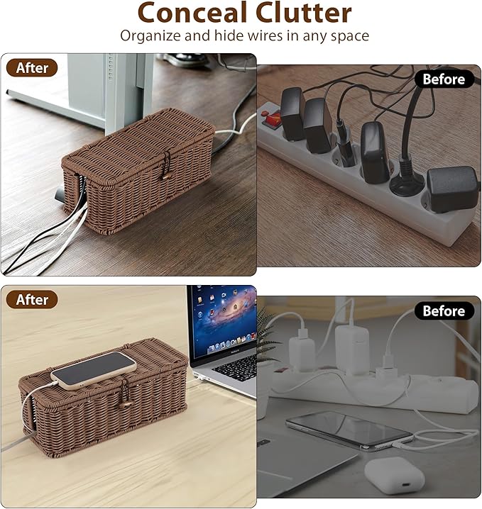 - Nice Looking Faux Rattan Cable Box: Cord box for wires on floor provide an attractive solution to organize and hide wires in any space, perfect for de-cluttering your desk, counter top, ideal for home, office, or dorm room