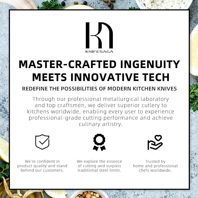 - Confidence in Every Cut: KnifeSaga has developed an innovative steel with optimized structural composition and carbon content. Each blade features an incredibly sharp 10° cutting edge, ensuring every slice is smooth, swift, and precise.