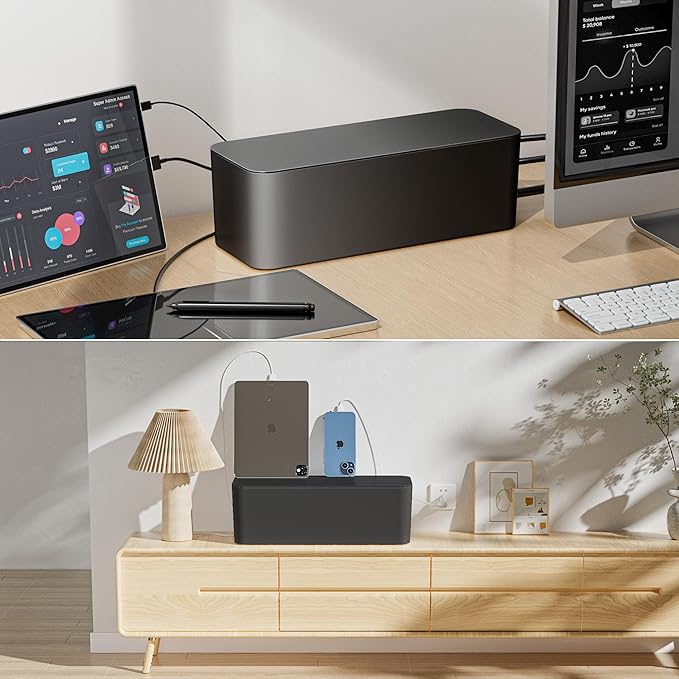 - Efficient Safety Protection Design, Dustproof & BiteProof: This cable management box features a dustproof, bite-proof, and child-resistant design, effectively preventing pets, children, and family members from accessing power outlets and exposing wires, which can pose safety risks.The cable box provides additional power management protection in households, offices, bedrooms, or workspaces, making the cord box an essential solution for power strip management in homes and offices.