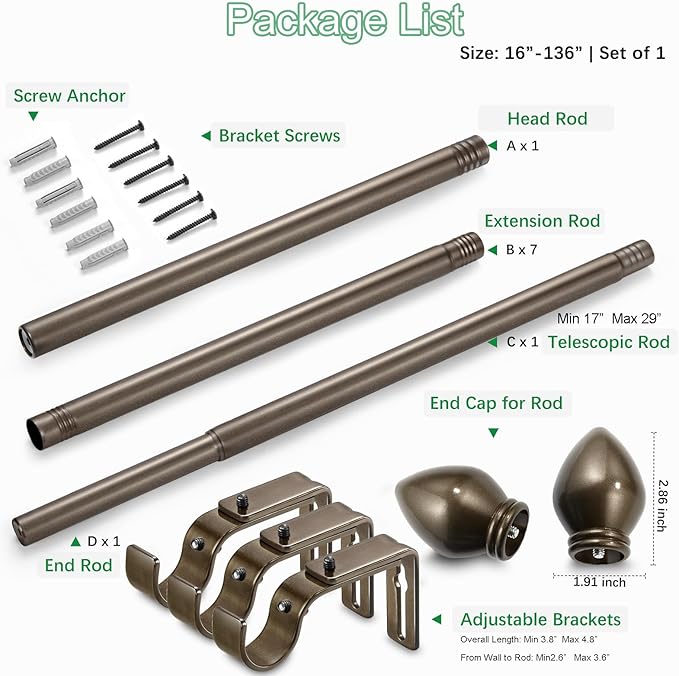 - EASY INSTALLATION: Single curtain rod package include one telescoping curtain rod comes complete with all the hardware needed for easy set-up, brackets, screws, anchors and instructions