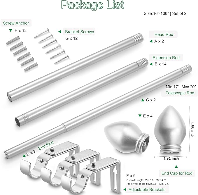 - EASY INSTALLATION: Single curtain rod package include one telescoping curtain rod comes complete with all the hardware needed for easy set-up, brackets, screws, anchors and instructions