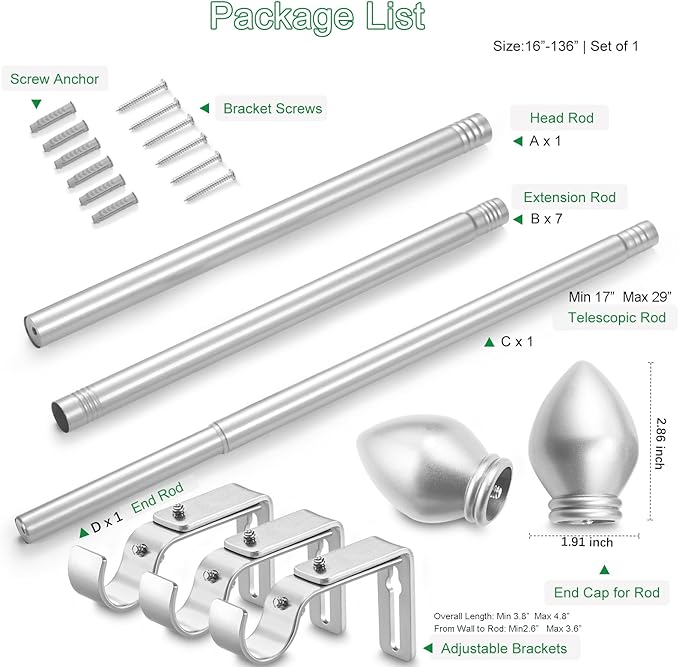 - EASY INSTALLATION: Single curtain rod package include one telescoping curtain rod comes complete with all the hardware needed for easy set-up, brackets, screws, anchors and instructions