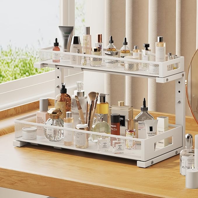 2 Pack 19IN Depth Under Sink Storage Organizer, Large 2-Tier Elegant Mesh Pull Out Shelf for Kitchen and Bathroom Cabinet Organization, L-Shaped and Adjustable Height Design-White