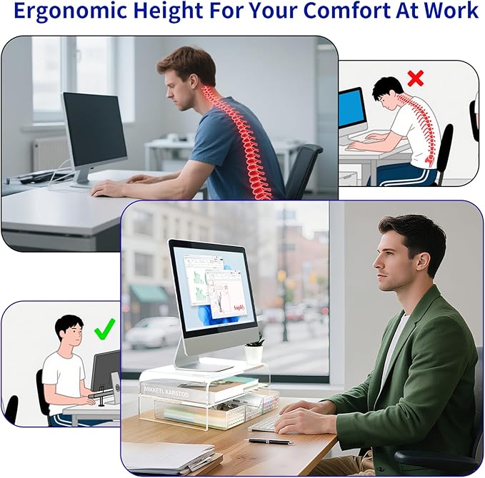 - 【Durable and Stable】:The crystal-clear acrylic computer stand is made of high quality material with sturdy construction, it can easily carry the weight of the display and computer accessories, to ensure stable and non-shaking for a long time, ideal for use in the office, dorm room or home