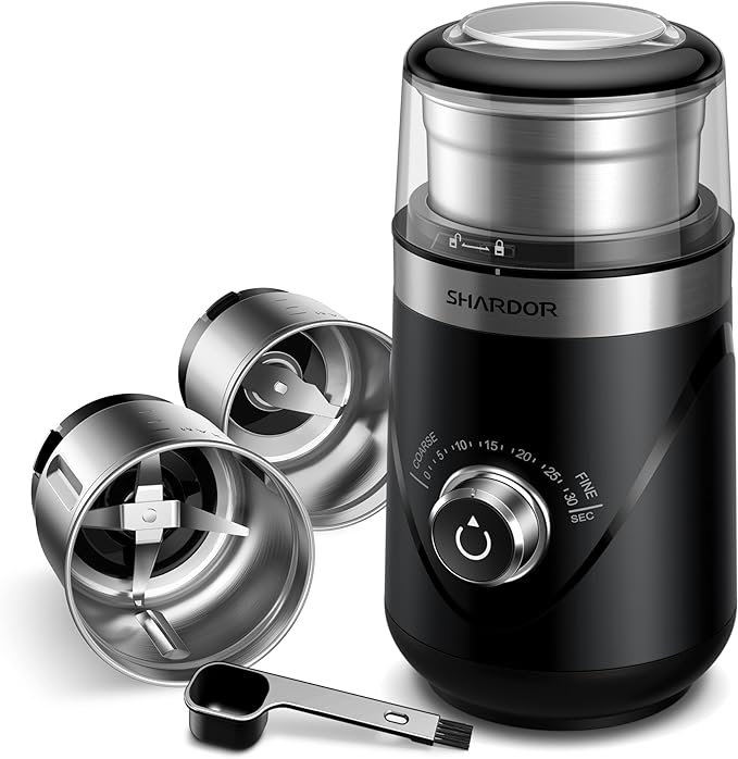 SHARDOR Electric Super Silent Blade Coffee Grinder, Timed Grind Control Rotary Knob, Adjustable Coarse to Fine for Coffee Beans, Spices & Herbs, with 2 Removable Stainless Steel Bowl, Black