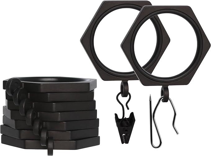 BlastHome® Luxury Curtain Rings - Premium Metal with Quiet, Smooth Nylon Inserts - Pinhooks and Clips Included - 1 1/2" Inside Diameter - 9 Rings for One Standard Curtain - Brushed Dark Brown