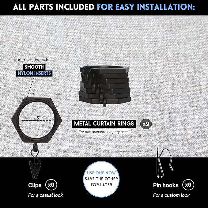 - 9 High Quality Heavy Metal Rings: Our Signature Collection raises the bar for curtain rod quality; these 9 1 ½ inch inside diameter rings are stylishly designed and plenty for two standard curtains