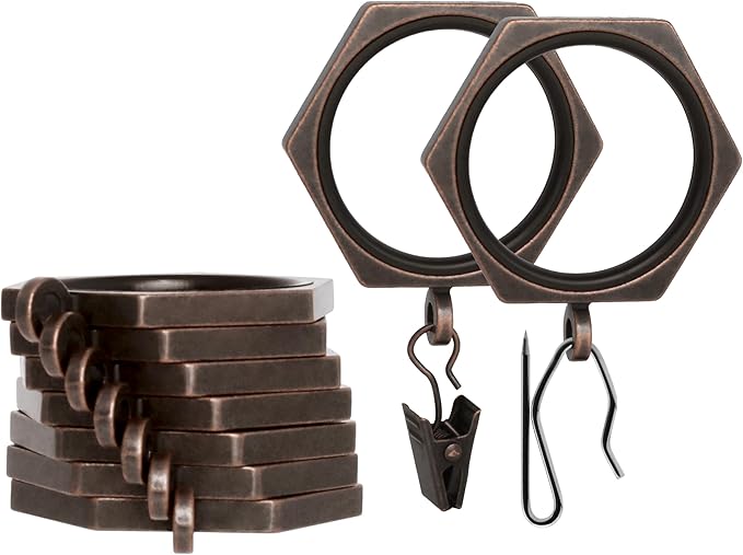 BlastHome® Luxury Curtain Rings - Premium Metal with Quiet, Smooth Nylon Inserts - Pinhooks and Clips Included - 1 1/2" Inside Diameter - 9 Rings for One Standard Curtain - Oil Rubbed Bronze