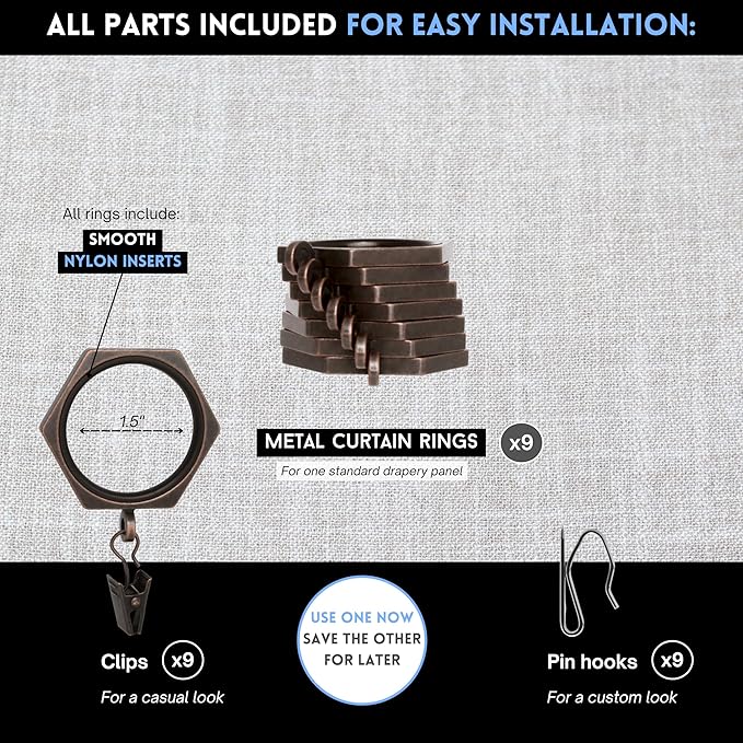 - Easy to Install: Our rings with eyelets make it easy to use included pin hooks or clips, so you can hang your curtains in a way that suits your room