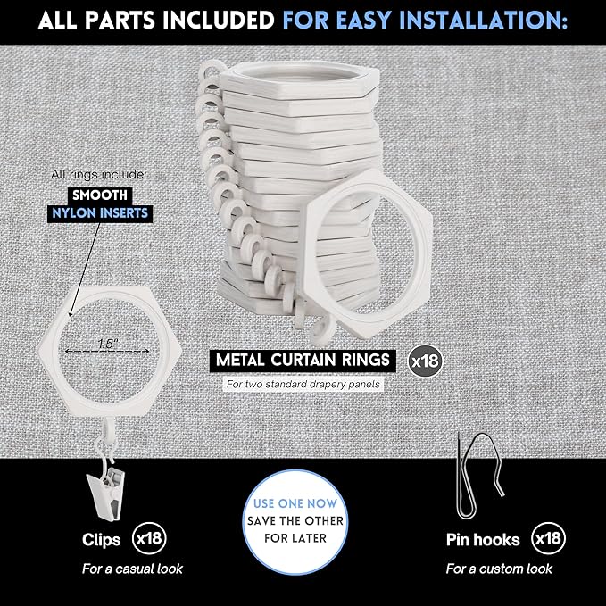 - 18 High Quality Heavy Metal Rings: Our Signature Collection raises the bar for curtain rod quality; these 18 1 ½ inch inside diameter rings are stylishly designed and plenty for two standard curtains