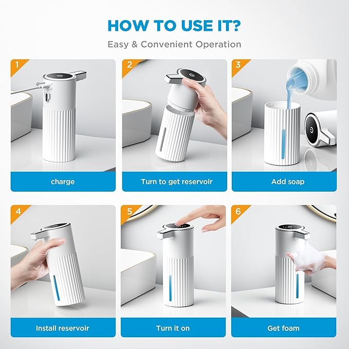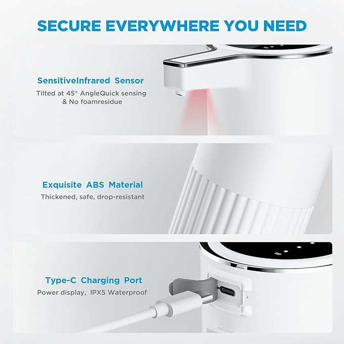 - 【USB-C Fast Charge Soap Dispenser Bathroom】: Built-in 1800 mAh battery allows this foam soap dispenser could last for 4 months on a single charge ,USB-C Rechargeable automatic soap dispenser help you say goodbye to constantly replace your battery.Use least energy and work perfectly for a long time.