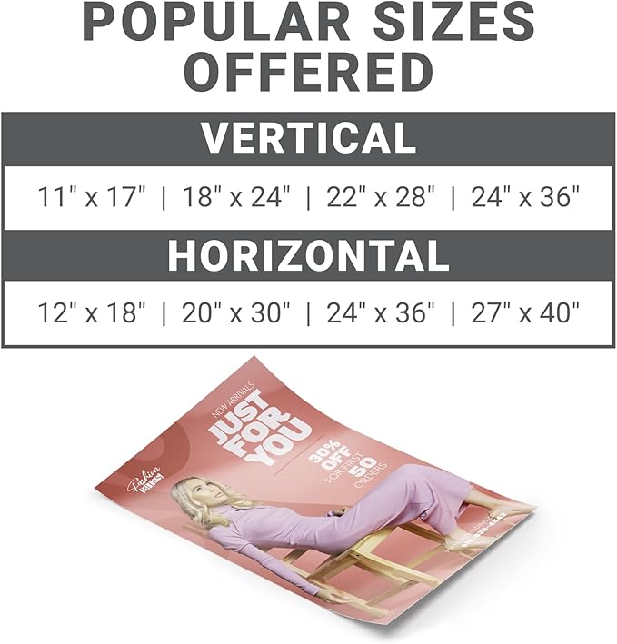 - Multiple Size Options: Custom large format posters are available in popular sizes, including 24" x 36", 18" x 24", 11" x 17", and 22" x 28". Please note that posters are delivered unframed.