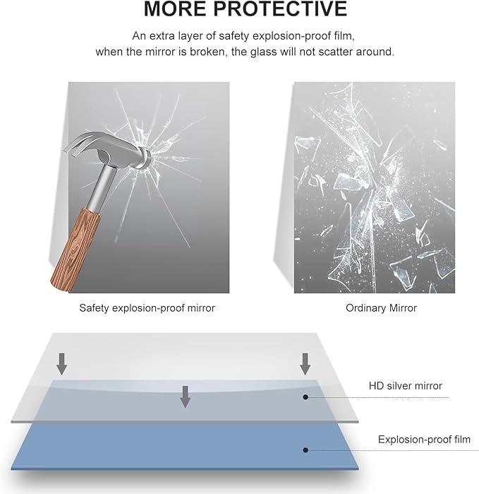 - 【Aviation-Grade Al Alloy Frame】 - The frame of this shatterproof mirror is crafted from aviation-grade aluminum alloy, ensuring rust resistance, durability, and a longer lifespan than plastic or regular metal frames. With its modern design, it also makes a stylish entryway mirror, adding sophistication to any space.