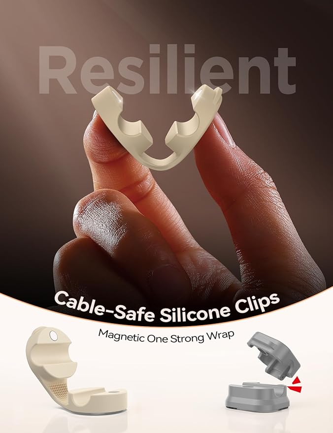 - Special Designed Silicone Magnetic Cable Clips: One-piece silicone molding design FLYLEAD cord organizer with better moldability, the soft silicone material makes this cable organizer more malleable and skin-friendly. After over 10,000 times of tensile tests, the flexible upper and lower joints never broke. With the strongest N55 magnets, covers can be tightly adherent to each other, soft silicone-made FLYLEAD cord holder could embrace cables, which won't squeeze or damage the cables