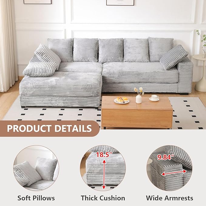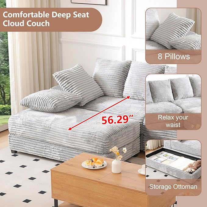 108" Oversized Sectional Sofa Modular Deep Seat Sofa Couch with Storage Ottoman, Upholstered Comfy Cloud Couches with 8 Pillows, Modern L-Shaped Corduroy Sofa Chaise for Living Room, Apartment, Gray