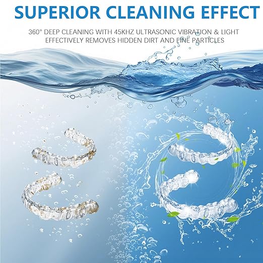 - Preferred by Most Aligner Users:Our ultrasonic retainer cleaner utilizes advanced 25W high-efficiency power and 45kHz ultrasonic frequency to provide a thorough 360-degree cleaning for braces, dentures, aligners, night guards, and mouth guards. This powerful cleaning technology is also perfect for more delicate items like jewelry, rings, and waterproof watches. For best results, use with specialized cleaning tablets, mouthwash, or professional cleaning solutions.