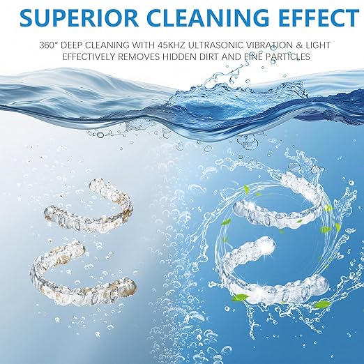 - Preferred by Most Aligner Users:Our ultrasonic retainer cleaner utilizes advanced 25W high-efficiency power and 45kHz ultrasonic frequency to provide a thorough 360-degree cleaning for braces, dentures, aligners, night guards, and mouth guards. This powerful cleaning technology is also perfect for more delicate items like jewelry, rings, and waterproof watches. For best results, use with specialized cleaning tablets, mouthwash, or professional cleaning solutions.