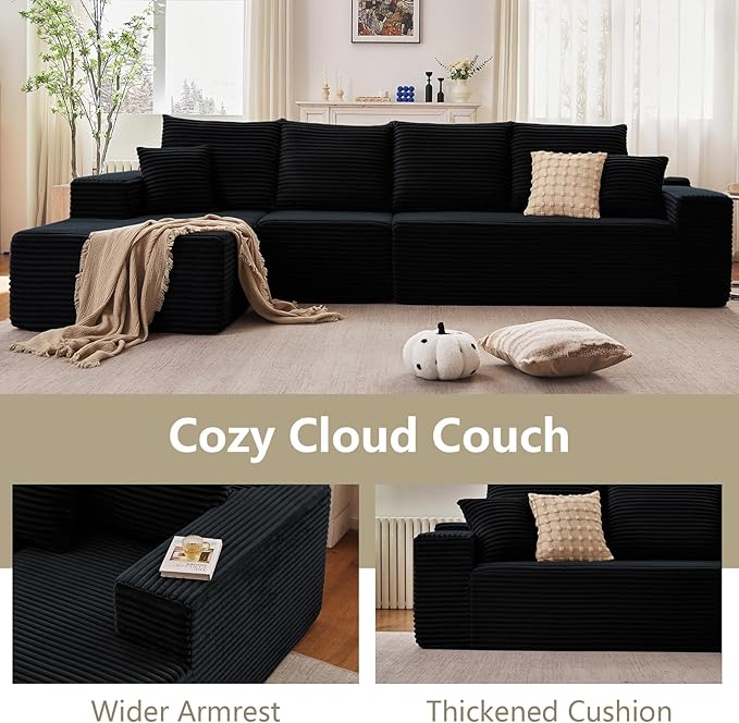 135" Modular Sectional Couches for Living Room, Comfy Boneless L Shaped Cloud Couch with Chaise Lounge, Modern Cozy Corduroy Deep Seat Floor Sofa, Memory Foam, No Assembly Required, Black