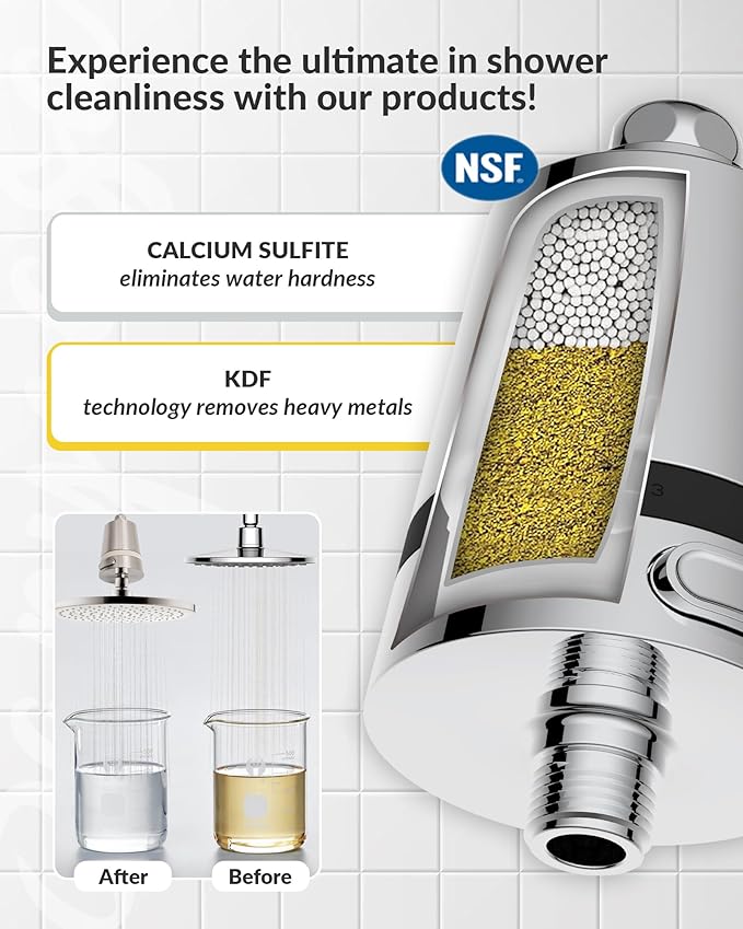 - 【NSF-177 Certified Filtration System for Superior Chlorine Reduction】This shower head filter features a premium dual-media filtration core, combining 75% KDF-55 and 25% calcium sulfite—engineered for high-efficiency contaminant removal. Certified to NSF 177, it effectively reduces chlorine and other impurities during shower use, ensuring a safer, gentler water experience for your skin and hair.