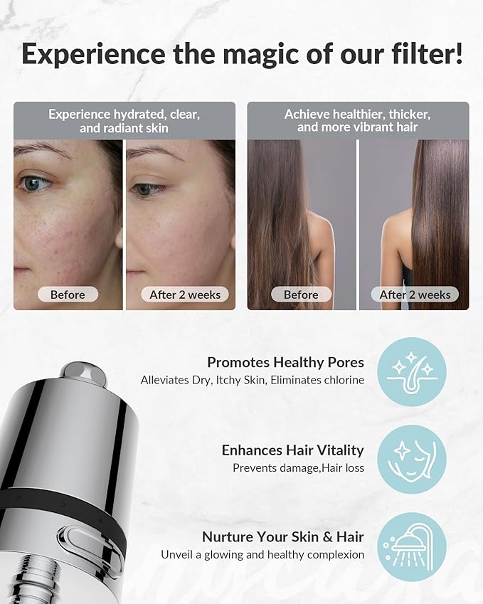 - 【Gentle Enough for Daily Use by All Ages】Say goodbye to redness and hair damage caused by harsh shower water. Ideal for families and individuals with sensitive skin or scalp concerns. This shower head filter for hard water helps restore moisture, reduce irritation, and improve hair texture by reducing harsh chemicals from your water supply.