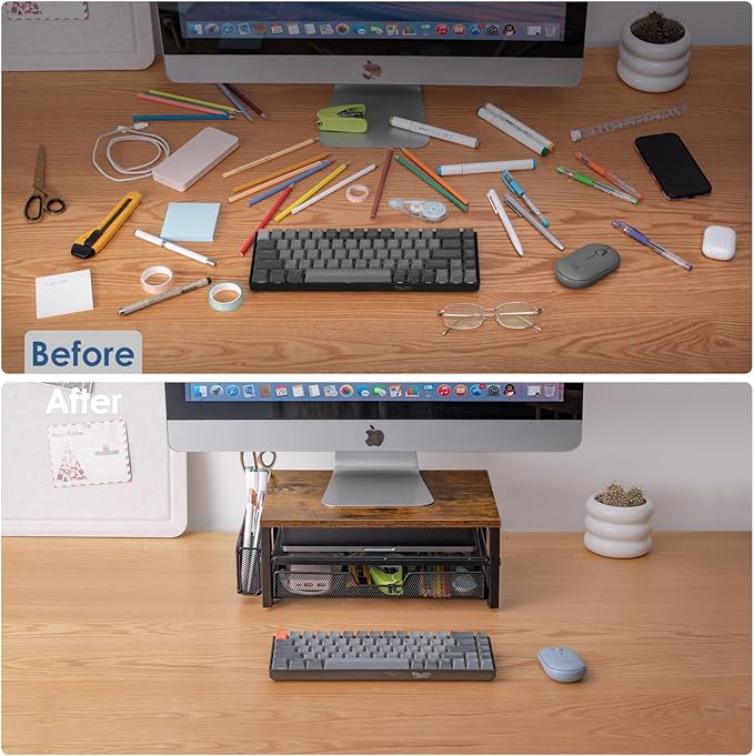 - Space-Saving & Versatile: Not only a monitor riser, but also a functional storage solution—store files, laptops, or personal items in the spacious drawers, while also displaying books or cosmetics on top.