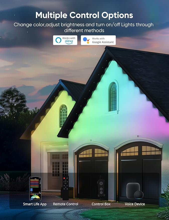 - Multiple Control Options: 1. Connect wired outdoor lights via the "Smart Life" app for seamless smart control. 2. Operate using the included remote or control box. 3. Integrate with Amazon Alexa or Google Assistant for convenient hands-free voice commands for our permanent house lights outdoor. (Note: Compatible with 2.4 GHz Wi-Fi only)